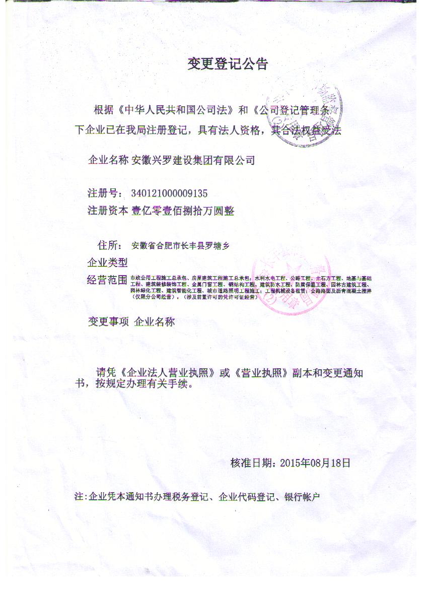 安徽兴罗建设工程有限公司正式更名为安徽兴罗建设集团有限公司